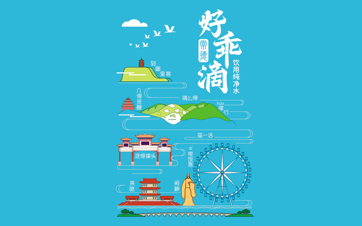 在常德旅游產(chǎn)業(yè)大發(fā)展的環(huán)境下,亟需具有文化性、傳播性、低成本的文創(chuàng)產(chǎn)品作為旅游宣傳載體,而小瓶裝純凈水,可以很好的起到常德旅游形象宣傳的目的,在水包裝上挖掘地域文化,用小瓶裝水傳播常德旅游,且成本非常低廉。 如何在小瓶裝水的包裝上體現(xiàn)常德旅游特色和常德地域文化,這是一個非常大的挑戰(zhàn)。且瓶裝水包裝幅面有限,在極小的幅面內(nèi)選擇怎樣的元素體現(xiàn)常德旅游和地方文化,如何挖掘、篩選這些元素,需要深入考察和研究地方文化。 中世銳意設計將常德旅游景點的代表元素做了篩選,并用當下流行、時尚的插畫手法繪制出象征圖形,形成了非常直觀的旅游資產(chǎn)的展現(xiàn)。 并注意到常德方言是一個非常有趣的地方語言文化,原滋原味的常德方言隨著社會經(jīng)濟的發(fā)展逐漸被輕視和消亡,而作為極具地方特色的常德方言,是地方文化的無形資產(chǎn)。于是,中世銳意設計深挖原滋原味常德方言,讓一句句鮮活的方言短語與美麗景色插畫相結合,形成旅游資產(chǎn)+地域文化的綜合展現(xiàn)。 當這款“好乖滴常德” 瓶裝水出現(xiàn)在常德大街小巷時,對于本地人來說,熟悉的常德景色與家鄉(xiāng)話是那么親切,自豪感油然而生;對于外地游客,瓶裝水上的美麗景色或許會成為他們下一站旅行的目的地,而水瓶上有趣、陌生的地方方言,會成為他們來到常德之后輕松掌握常德話的啟蒙工具,輕松學上兩句常德話,將成為愉快的交流場景。
